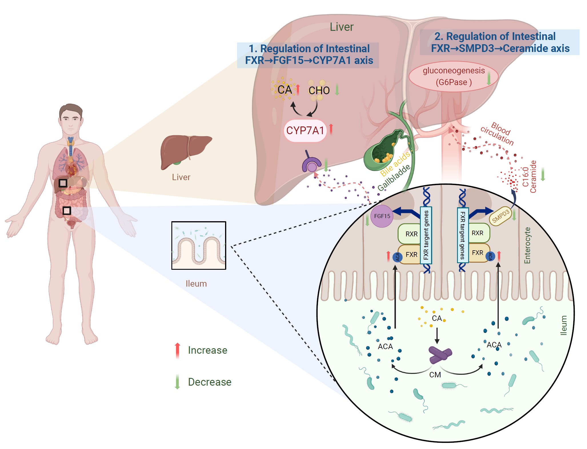 研究团队对88个在代谢疾病人群队列中显著降低的肠道微生物进行胆酸转化谱表征,发现以小克里斯滕森氏菌(Christensenella minuta)为代表的9个肠道微生物可以通过3-O-酰基化修饰产生一类全新的次级胆汁酸,这是迄今发现的第六种微生物介导的胆汁酸修饰新模式。体外实验证明酰基胆酸为一类全新的肠道特异性法尼醇X核受体(FXR)天然拮抗剂。模型小鼠灌胃实验证明, C. minuta通过在肠道中产酰基胆酸靶向抑制肠FXR,调控肠肝信号轴,进而发挥缓解糖脂代谢异常的功能,且这种益生效果在肠上皮FXR特异性敲除小鼠中完全消失。人群队列实验发现,3-O-酰基胆酸在健康人粪便中广泛存在,在II型糖尿病患者中明显降低,这证明了小克里斯滕森氏菌和酰基胆酸在代谢性疾病的治疗与预防中具有应用前景,相关菌株和代谢物已经申请专利(CN 114524857,CN 114573655,ZL 2021105334244.1)。