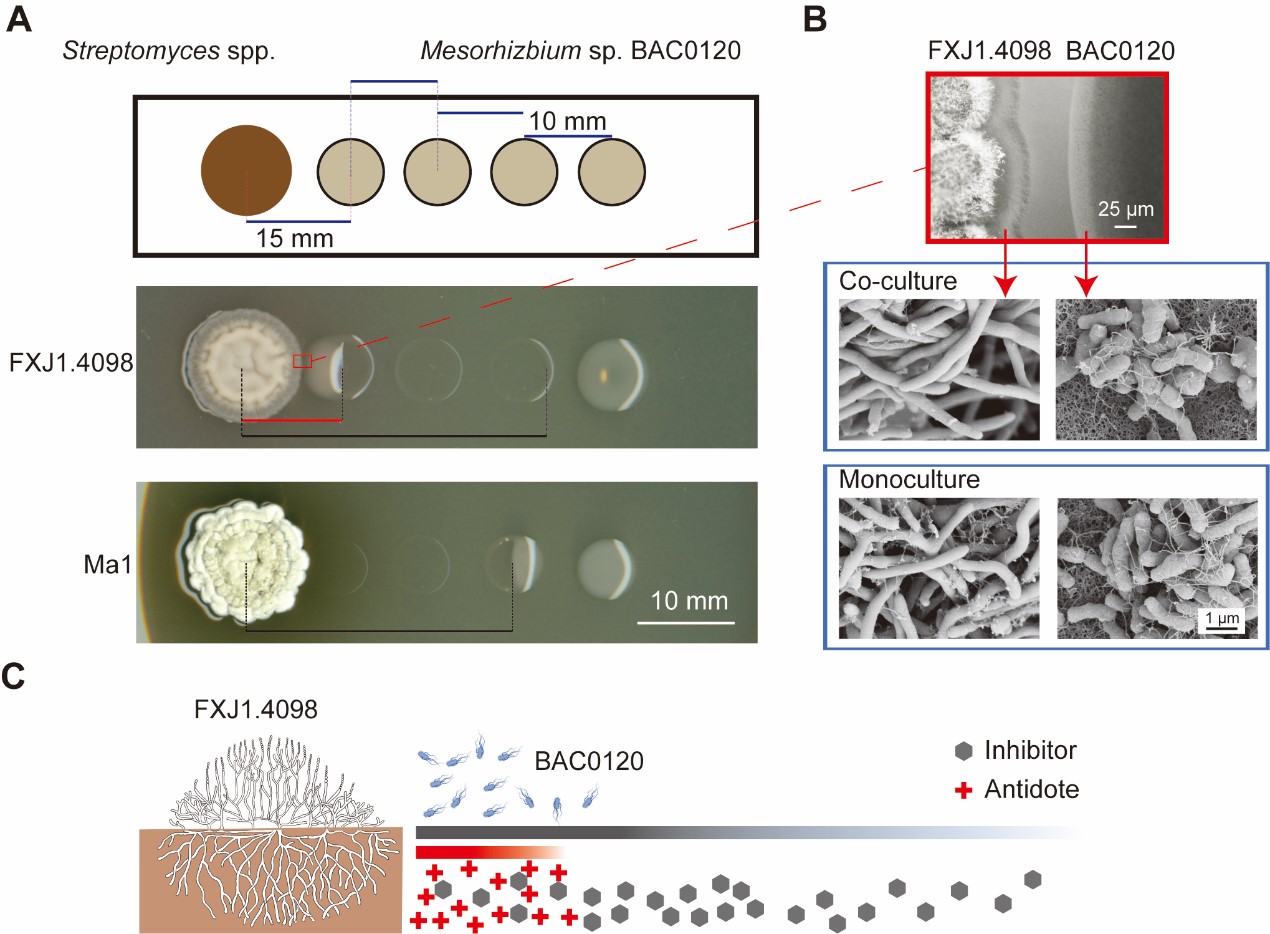 近日,中国科学院微生物研究所黄英研究团队在The ISME journal 发表论文,题为Proximity-based defensive mutualism between Streptomyces and Mesorhizobium by sharing and sequestering iron,揭示了链霉菌与中慢生根瘤菌之间邻里防御性互惠的互作现象和机制,并探索了这一互作策略的普遍性和生态意义。
