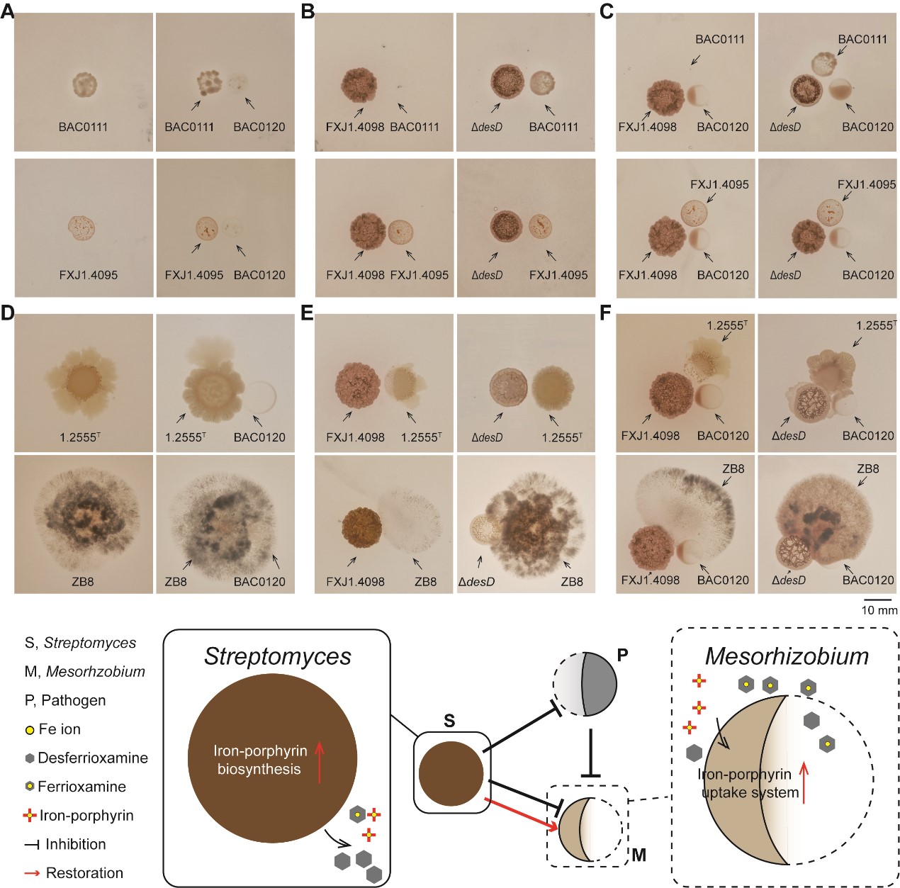 团队发现红壤来源链霉菌Streptomyces sp. FXJ1.4098与中慢生根瘤菌Mesorhizobium sp. BAC0120之间具有新颖的“近交远伐”互作现象,称之为“邻里防御性互惠(proximity-based defensive mutualism,PBDM)”。机制研究表明,这两种微生物之间由代谢物介导的铁竞争和共享是形成PBDM的原因:Streptomyces sp. FXJ1.4098产生一种易于扩散的铁载体--去铁胺(desferrioxamine),使培养基中的铁不能被共培养的Mesorhizobium sp. BAC0120利用,从而抑制后者生长;同时Streptomyces sp. FXJ1.4098还释放出扩散性较差的铁卟啉类化合物,可被邻近的Mesorhizobium sp. BAC0120利用,从而恢复后者的生长。在三元微生物互作中,PBDM策略有助于保护靠近Streptomyces sp. FXJ1.4098的Mesorhizobium sp. BAC0120免受其他竞争者的抑制,从而使这两类植物促生菌得以共存。更大范围的微生物互作筛选表明,PBDM策略可能广泛存于中慢生根瘤菌和红壤来源链霉菌之间。本研究揭示了铁元素在复杂微生物互作中的关键作用,为土壤中植物促生菌的共存提供了新见解,对认知微生物间生态互作作出重要贡献。