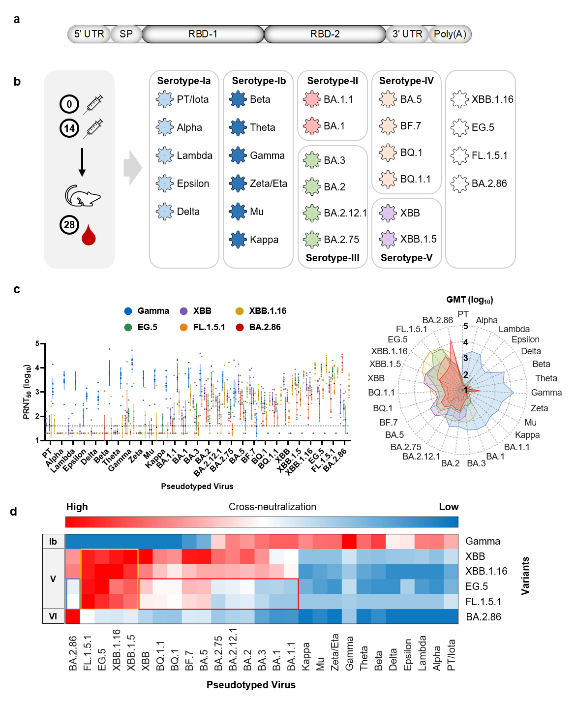 团队以小鼠血清交叉中和的方法系统研究了XBB.1.16、EG.5、FL.1.5.1和BA.2.86的RBD抗原性,发现XBB.1.16、EG.5和FL.1.5.1的抗原性与XBB较为类似,可以列入V型。然而,BA.2.86的抗原谱与Ib型、V型及此前研究中的I-IV型均存在明显差异,已经成为一种新的血清型,即VI型(图1),提示基于XBB抗原的新冠疫苗存在被BA.2.86及其后续衍生变异株逃逸的风险。