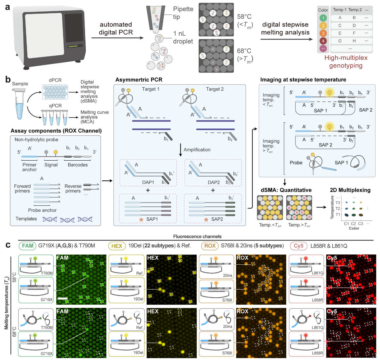 数字PCR技术为精准医学提供了强有力的支撑,但现阶段其应用受限于设备成本高昂、芯片耗材操作复杂性等因素。研究团队基于之前开发的振动微滴技术,合作研发出一款集成自动化的数字PCR一体机。该设备不仅能够在分钟级别内制备数以万计的均一微滴,还整合了温控扩增、多荧光通道成像以及AI辅助的数据分析模块,大幅降低了操作难度和成本,同时保证了检测的高准确性和重复性。尤其在多重检测能力方面,其基于荧光通道和熔解温度的创新2D编码技术——数字阶梯熔解分析(digital Stepwise Melting Analysis, dSMA),成功实现了35种非小细胞肺癌EGFR基因热点突变亚型的单管检出,展示了在临床诊断领域的应用潜力。