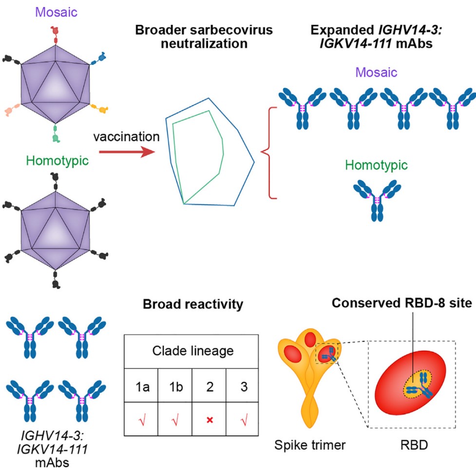 Sarbecovirus(沙贝冠状病毒)包含SARS-CoV,SARS-CoV-2以及一些具有潜在传染人风险的动物源性冠状病毒,未来有可能成为新的大流行病原,研制泛沙贝冠状病毒的广谱疫苗对于应对这一潜在风险具有重要意义。之前有研究表明,马赛克纳米颗粒疫苗针对沙贝冠状病毒可诱导产生广谱中和抗体,针对异源病毒的攻击可以提供更好的保护。但其免疫学基础尚未阐明。