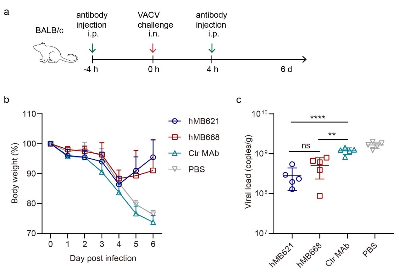 本研究首先评估了在天花疫苗接种计划结束前出生的牛痘疫苗接种者对MPXV B6抗原蛋白的先存抗体水平,然后从一个接种者中鉴定分离出两株单克隆抗体,hMB621和hMB668,它们靶向B6蛋白上的不同抗原表位。结合实验证明,这两株单克隆抗体均表现出了对B6及其在痘苗病毒(VACV)、天花病毒(VARV)和牛痘病毒(CPXV)中同源蛋白的广泛结合能力。中和实验证明,这两株抗体对VACV表现出强效的中和作用(图1)。动物体内抗病毒实验表明,通过腹腔注射给药,这两株单克隆抗体均展现出对VACV有效的体内保护作用(图2)。此外,研究还解析了B6和hMB668的复合物结构,首次揭示了B6的结构特点以及抗体的结合表位。