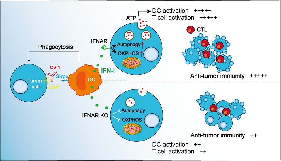 在本研究中,研究团队利用多种小鼠肿瘤模型发现,肿瘤细胞对IFN-I的反应性,而不是对IFN-II的反应性,决定了CD47阻断剂的肿瘤治疗效果。进一步的机制解析表明,一方面,IFN-I信号可以重编程肿瘤细胞的代谢过程,促进ATP的生成;另一方面,IFN-I信号还增加了肿瘤细胞的分泌性自噬,帮助ATP的细胞外释放。进一步研究发现,细胞外ATP激活了树突状细胞,促进了肿瘤特异性T细胞应答的产生。通过基因敲除的方式抑制肿瘤细胞的氧化磷酸化或自噬,或用抑制剂阻断肿瘤微环境中的细胞外ATP,几乎完全抑制了CD47靶向治疗的效果。基于上述发现,采用CD39或CD73的抑制剂,抑制肿瘤微环境中胞外ATP的降解和腺苷的生成,可以显著提高CD47阻断剂的治疗效果。上述研究结果为CD47靶向肿瘤免疫治疗药物的研发、临床试验的设计和临床效果的预测评估提供了理论指导和新的思路。