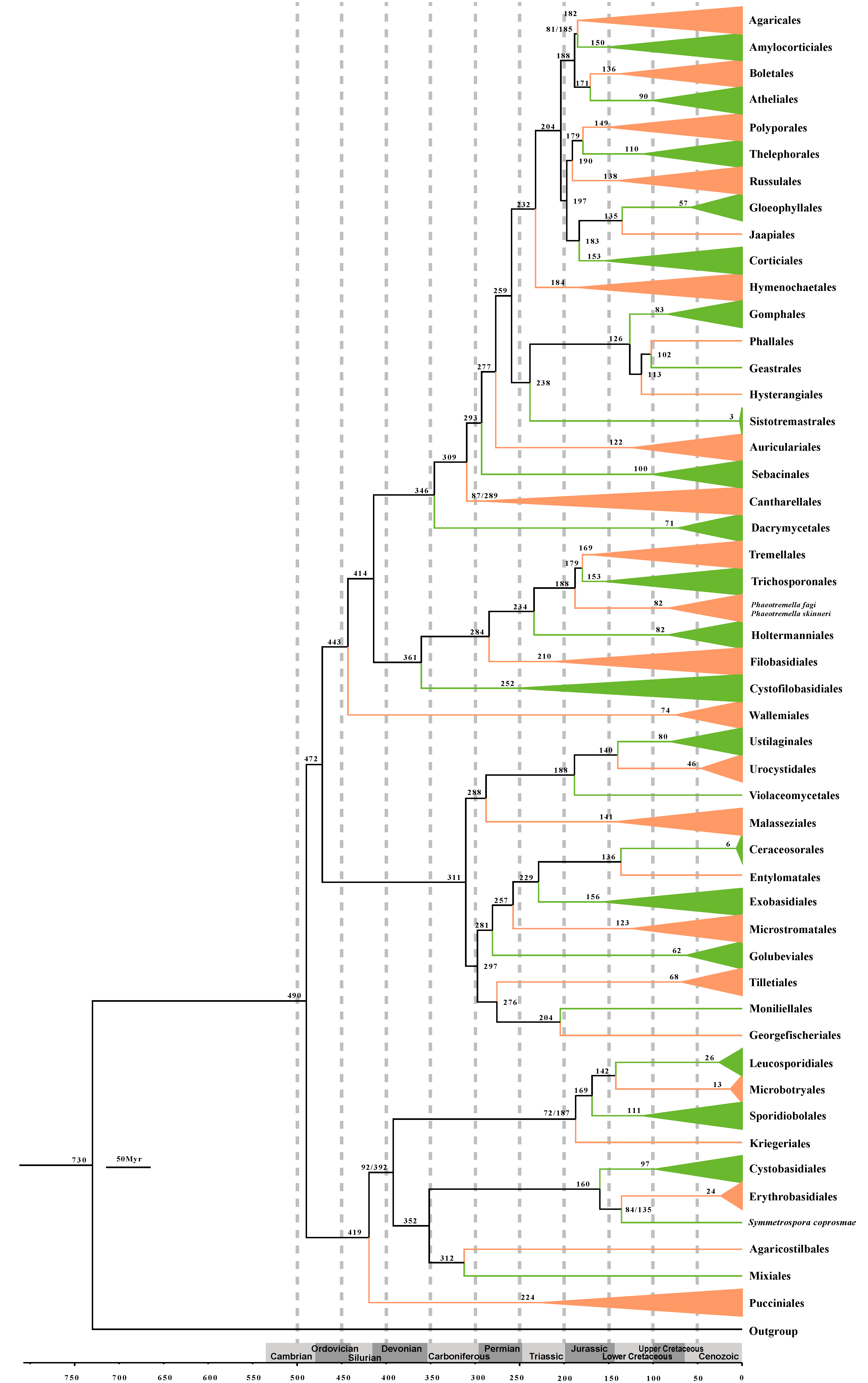 赵瑞琳团队以488个物种的基因组数据为基础,通过提取1764个直系单拷贝同源基因构建担子菌门系统演化基因组发育图谱(图1)并估算各个阶元演化时间范围,更新了担子菌门分类系统至4亚门、20纲、77目、297科和2134属。团队同时编撰了担子菌门目等级的分类词典,澄清多个分类学问题,进一步稳定了担子菌门分类系统。相关研究成果在中科院微生物所国家微生物科学数据中心相关网站同步更新https://nmdc.cn/macrofungi/,提供了完整准确的分类信息。