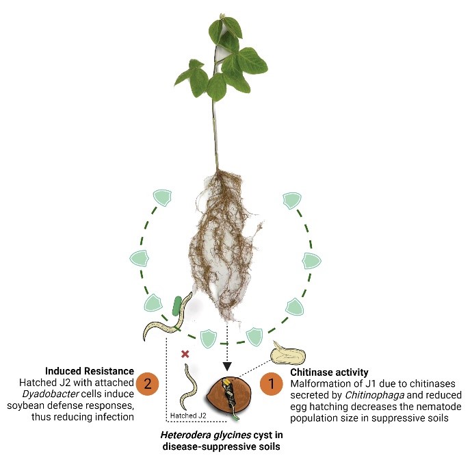SCN是大豆最重要的病原物,而长期连作大豆后SCN会衰退形成抑制性土壤,即使大量接种SCN,抑制性土壤仍然会对SCN免疫。研究通过对吉林及黑龙江的SCN抑制性土壤和发病重的导病土系统研究及室内盆栽试验,对抑制土、导病土、传导土(10%抑制性土壤+90%导病土)及消毒土(80°C及福尔马林处理)的微生物组分析,揭示了抑制性土壤中SCN的孢囊富集了Chitinophaga属和Dyadobacter属细菌;Chitinophaga spp.通过产生几丁质酶抑制和杀死线虫卵,Dyadobacter sp.则通过附着SCN二龄幼虫进入大豆根部诱导大豆植株抗性;并且通过土壤接种这两株细菌验证了其对SCN的抑制作用。