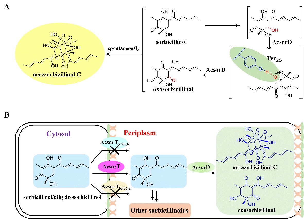 参与真菌次级代谢物生物合成的关键酶和中间产物常定位于细胞特定的区域,这种区室化分布有助于酶促反应的发生,避免中间产物积累导致的对产生菌造成的负担和毒害,从而有利于菌株自身的生长。团队前期的研究(Org. Lett. 2024, 26, 642−646)发现,顶头孢霉中一个特殊的Berberine Bridge Enzyme-like (BBE-like )氧化酶AcsorD催化acresorbicillinol C的合成,并解析了其催化机制(图1A)。然而,与存在于细胞质中参与acresorbicillinol C骨架合成的聚酮合酶不同,氧化酶AcsorD存在于细胞的周质空间,暗示acresorbicillinol C存在区室化合成。本研究从参与acresorbicillinol C合成的转运蛋白入手,通过遗传学、生物化学和计算生物学等手段,阐明了定位于细胞质膜的转运蛋白将acresorbicillinol C合成的关键中间体sorbicillinol从细胞质转运至周质空间,从而介导定位于周至空间的BBE-like 氧化酶AcsorD催化笼状化合物的合成(图1B)。该研究系统回答了笼状骨架化合物acresorbicillinol C的合成和转运机制,为丝状真菌活性先导化合物的开发和应用奠定了理论基础。
