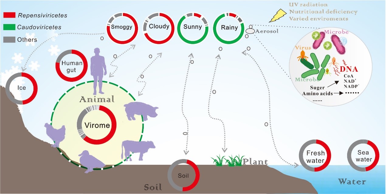土壤、水体、冰川及动植物等来源的病毒,包括流感、冠状病毒等致病病毒,能够通过气溶胶远距离扩散和传播,从而对环境和生态健康造成潜在的危害。但由于空气病毒样本收集困难、缺乏标准标记基因以及检测工具,空气病毒组的丰度、群落组成、代谢特征及传播机制等尚不清楚。因此,开展空气病毒组学研究对于理解它们在生态系统及人类和动植物健康中的作用很有必要。