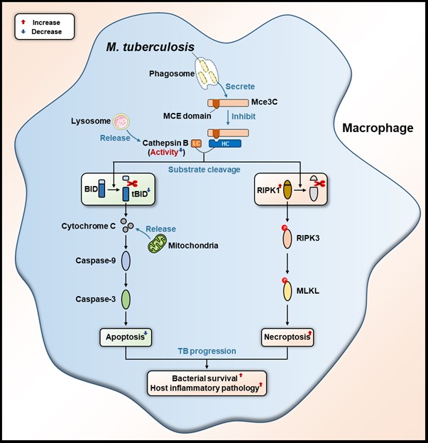 结核病(tuberculosis,TB)是由Mtb引起的一种重大慢性传染病,目前已重新成为全球由感染导致死亡的首要原因。TB患者常伴随肺组织的炎性损伤与干酪样坏死,主要原因在于Mtb能够诱导宿主细胞发生炎症性坏死。该研究发现,在感染过程中,Mtb的效应蛋白Mce3C能够与宿主溶酶体释放的组织蛋白酶B(cathepsin B,CTSB)直接结合,进而抑制其对细胞死亡相关底物蛋白BID和RIPK1的剪切。在宿主细胞中,CTSB是调控宿主细胞死亡程序的关键分子节点:一方面,CTSB剪切BID将产生可促进凋亡(apoptosis)的tBID活性片段;另一方面,CTSB剪切RIPK1则将使其失去全长分子才具备的促进坏死性凋亡(necroptosis)的活性。因此,Mce3C介导的CTSB酶活抑制能够抑制宿主细胞凋亡并转而促进细胞发生坏死性凋亡。在小鼠感染模型中,当Mtb Mce3C与宿主CTSB互作区段缺失或突变时,宿主肺组织中被感染的细胞发生凋亡的比例显著上升,而发生坏死性凋亡的比例显著下降,同时伴随着细菌载量的减少与肺组织炎症损伤的减轻。