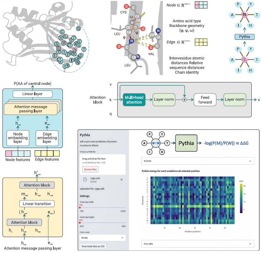 近日,中国科学院微生物研究所吴边和崔颖璐团队在The Innovation上发表题为“Structure-based self-supervised learning enables ultrafast protein stability prediction upon mutation”的研究论文。该研究开发了一种基于结构自监督学习的深度学习框架Pythia,可以快速预测蛋白质突变的稳定性变化(ΔΔG)。该研究不仅揭示了蛋白质三维结构蕴含的进化语义信息与热力学稳定性之间的深层关联,还通过开源代码(GitHub链接)与Web服务器技术服务体系,为蛋白质工程领域提供了便捷的研究工具。蛋白质突变效应预测是解码分子进化机制、优化蛋白质工程改造的关键物理量。然而,传统预测方法面临两大挑战:一是基于物理力场的计算方法(如自由能微扰)计算复杂度高,难以满足大规模筛选需求;二是依赖于实验数据的监督学习方法易受训练集偏差影响,泛化能力受限。针对这些问题,研究团队提出了基于三维结构自监督学习的深度学习框架Pythia。该框架融合了图神经网络与注意力机制,可直接从蛋白质结构中学习氨基酸之间的相互作用。这种"零监督"预训练策略突破了传统方法对标记数据的依赖性,成功捕获了蛋白质折叠过程中隐藏的物理化学约束规律。
