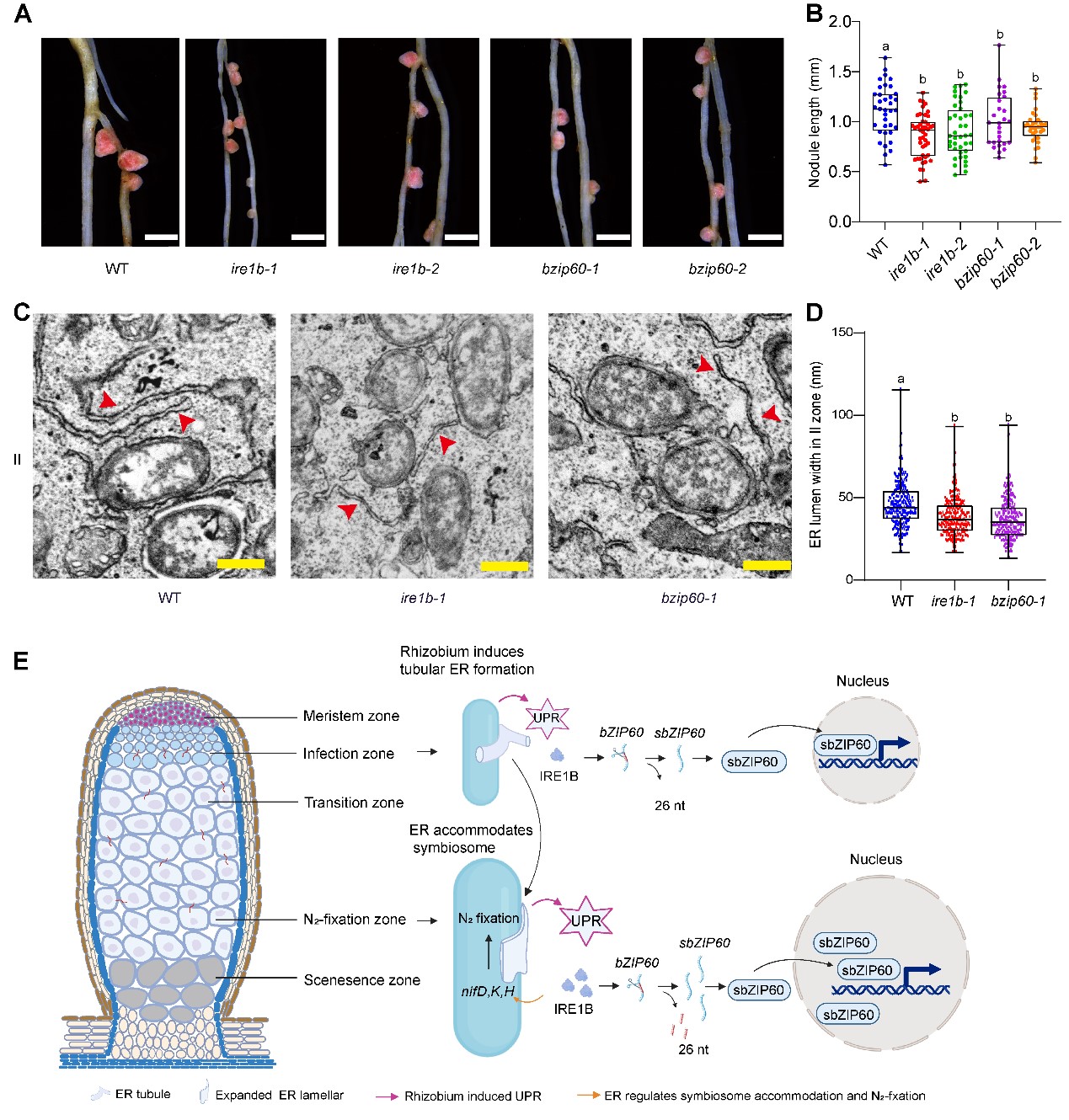 近日,中国科学院微生物研究所孔照胜团队在Advanced Science上发表了题为“Control of Rhizobia Endosymbiosis by Coupling ER Expansion with Enhanced UPR”的研究论文。该研究揭示了内质网(ER)扩张与未折叠蛋白质反应(Unfolded protein response, UPR)特异激活相耦合,协同调控根瘤菌内共生与高效固氮的机制,为优化根瘤菌内共生以促进共生固氮提供了新的思路,同时也对豆科植物分子设计育种提供了重要的理论指导。
