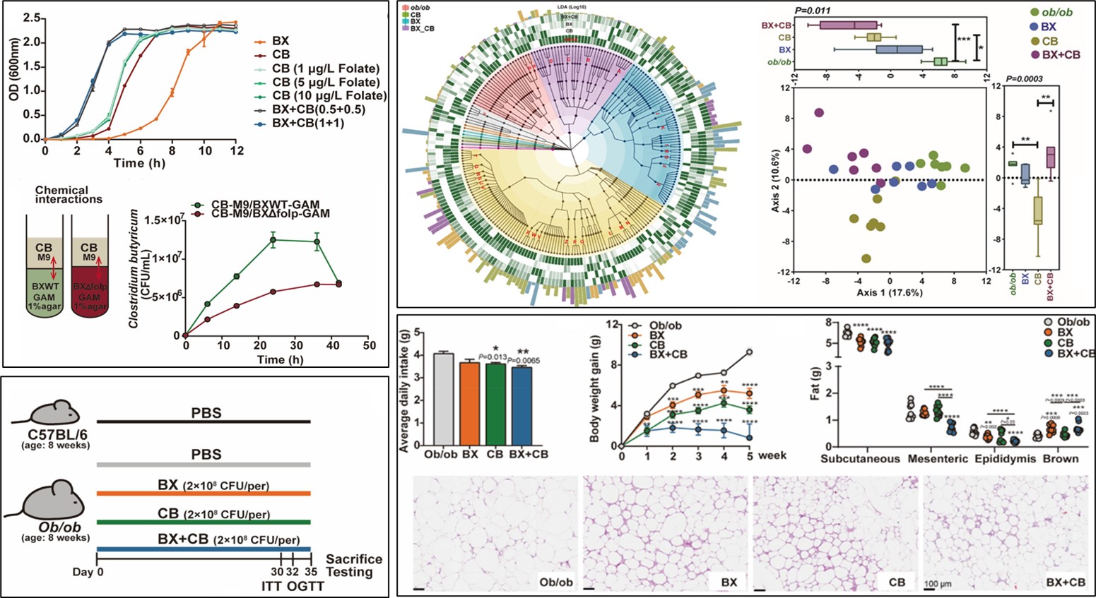 本研究通过宏基因组学与体外互作培养实验,发现两株解木糖拟杆菌 (Bacteroides xylanisolvens) 与丁酸梭菌( Clostridium butyricum)之间存在显著的营养共生关系:前者可合成叶酸(folate)支持丁酸梭菌的生长及产丁酸能力,而丁酸梭菌则提供叶酸前体对氨基苯甲酸(pABA)反哺前者的叶酸合成。这种互惠互利的共生机制有望显著增强两种菌在宿主体内的代谢稳定性和定殖能力。随后的灌胃模型动物实验也证实:双菌株组合比单一菌株更有效地降低肥胖模型小鼠的体重、改善其糖脂代谢异常和脂肪肝等病理表型。多组学分析表明,双菌组合能更均衡地调节肠道菌群组成,降低疾病相关通路和机会致病菌的丰度,从而恢复肠道菌群稳定性、增强治疗效果。该研究不仅验证了基于微生物共生机制设计最小功能菌群的可行性,还为开发治疗代谢疾病的活菌微生态药物提供了重要思路。