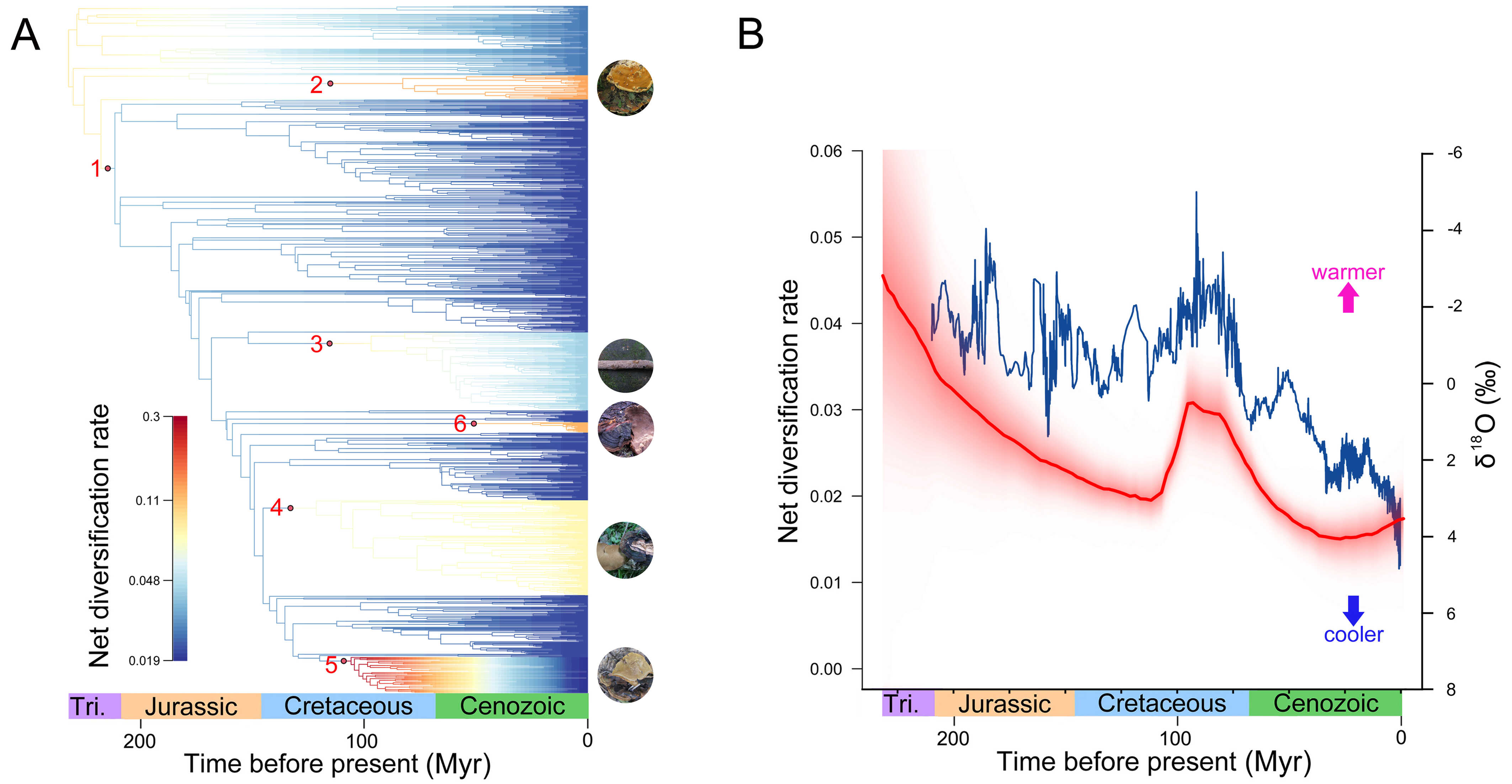 锈革孔菌目真菌的净物种多样化速率(A)及其演化趋势(B)