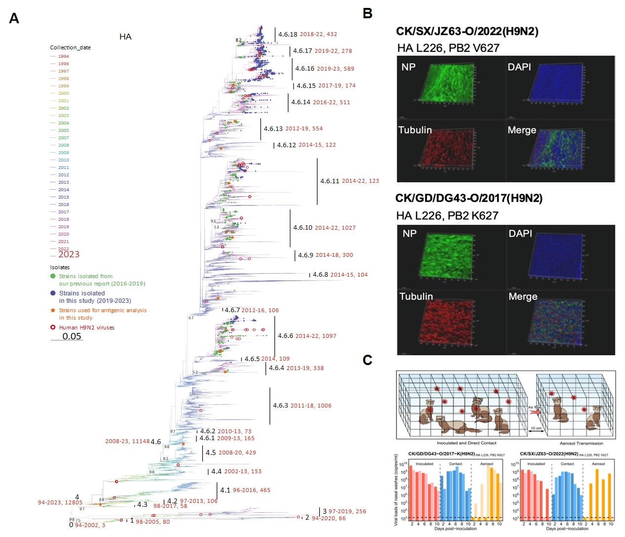 A.BJ94谱系H9N2病毒HA基因遗传演化分析及HA进化分支的命名标准与命名;B. H9N2禽流感病毒对人气管纤毛原代细胞的感染;C. H9N2禽流感病毒在哺乳动物间的水平传播