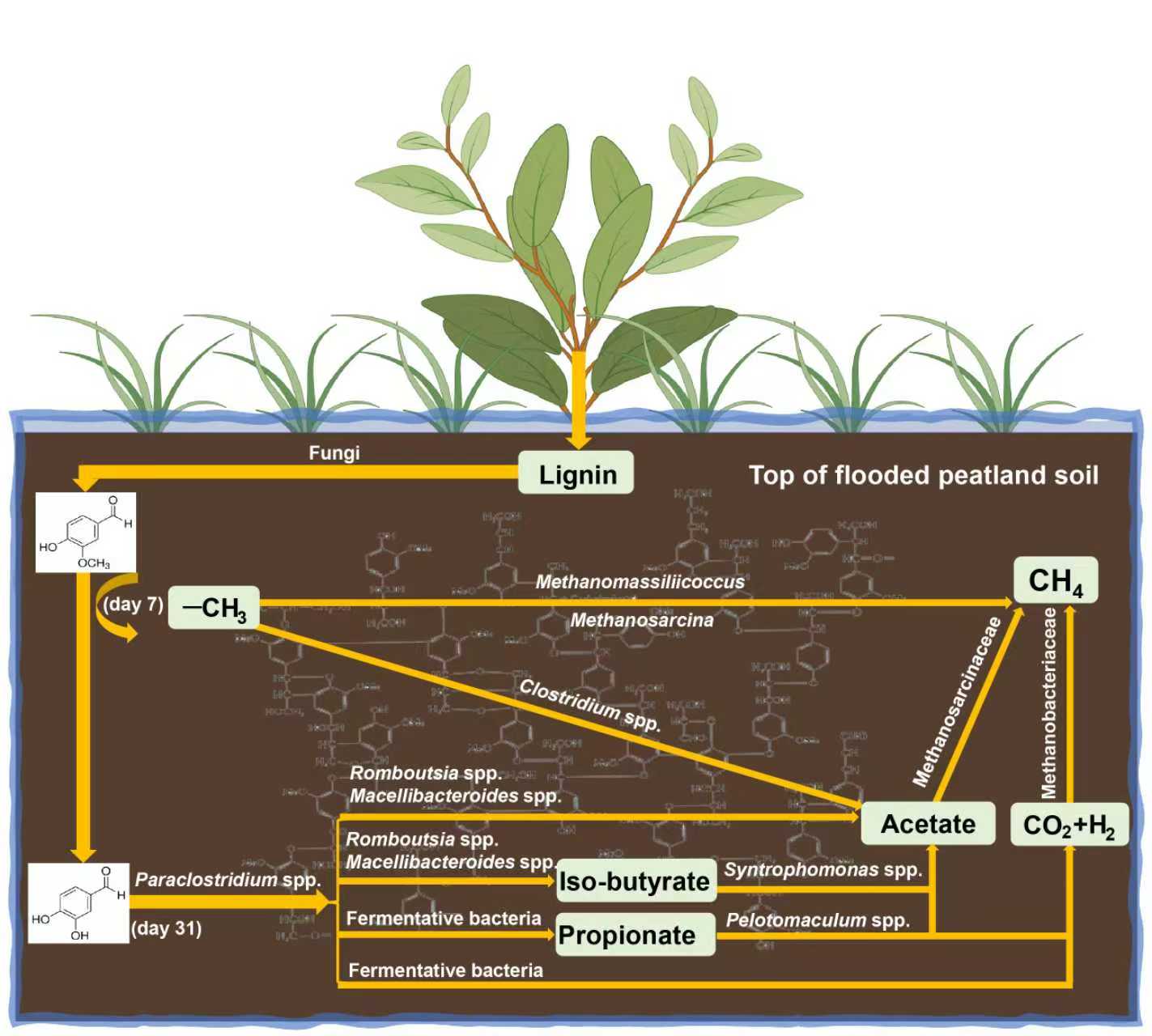 研究发现,与草本植物生长的土壤相比,中度灌木覆盖的泥炭地中的木质素含量更高,其甲烷排放量也高于草本土壤,暗示木质素可能是甲烷来源之一。在草本土壤微宇宙中添加较低浓度的木质素和单酚均能提高甲烷产量,计算表明木质素对总甲烷排放的贡献约为1.2% 至14.2%。同位素示踪和动态代谢组学分析显示,典型的木质素单酚--香草醛中的甲氧基首先转化为甲烷,然后,芳香环被厌氧细菌裂解开环、并发酵产生二氧化碳、乙酸盐、丙酸盐以及(异)丁酸盐,这些短链脂肪酸被互营细菌和产甲烷古菌协同转化成甲烷。木质素及其单酚的土壤培养物中均富集了甲基营养型的产甲烷菌Methanomassiliicoccus和Methanosarcina,表明它们参与氧甲基营养型产甲烷过程,并富集了具有苯环裂解的发酵细菌和互营细菌。该研究提示全球变暖加剧了灌木丛扩张,增加了土壤中的木质素含量;而这种巨量生物质木质素产甲烷的过程,又进一步加剧全球变暖。