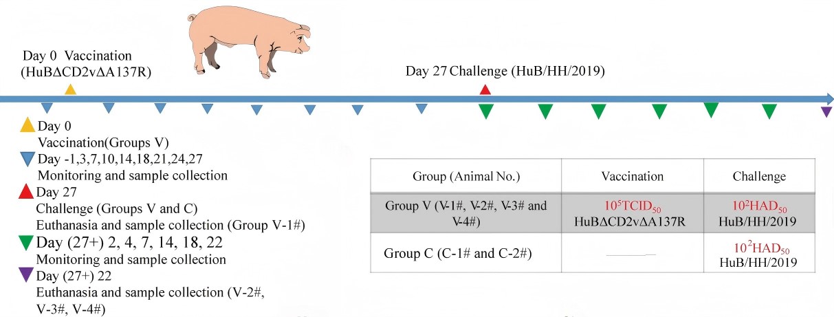 本研究以ASFV基因Ⅱ毒株HuB/HH/2019为骨架,利用CRISPR技术对ASFV毒力基因CD2v、A137R进行敲除改造,构建了ASFV减毒毒株。随后,研究团队将该减毒毒株接种仔猪,进行攻毒试验验证,建立了一套体内、体外多层次的ASF候选疫苗安全性和有效性评价体系。