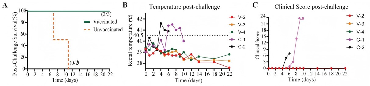 2025年9月3日,中国科学院微生物研究所、中国兽医监察所国家/WOAH猪瘟参考实验室和中国农业大学动物医学院等研究人员在Journal of Virology上发表题为An attenuated African swine fever virus with deletions of the CD2v and A137R genes offers complete protection against homologous challenge in pigs的研究论文。本研究通过基因改造构建了ASFV减毒毒株作为候选疫苗模型,建立了一套安全性和有效性评价体系。