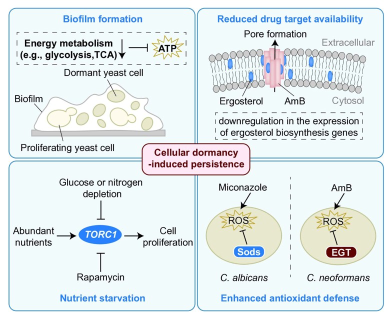 临床上,真菌复发感染和抗菌药物治疗失败高发,导致真菌感染相关病死率居高不下。药物持留(drug persistence)——由休眠细胞介导并能够抵御高浓度杀菌药物的杀伤作用——被认为是导致复发感染和治疗失败的关键因素。该综述中,团队阐释了药物持留的定义边界和体内外评价策略,梳理了真菌药物持留现象的发现与研究历程,并全面总结了其相关的分子机制。最后,文章展望了该领域未来亟待解答的重要科学问题,例如不同真菌感染疾病中,药物持留现象与患者预后之间有何关联;“宿主-药物-真菌”三方互作如何调控真菌药物持留的动态过程等。