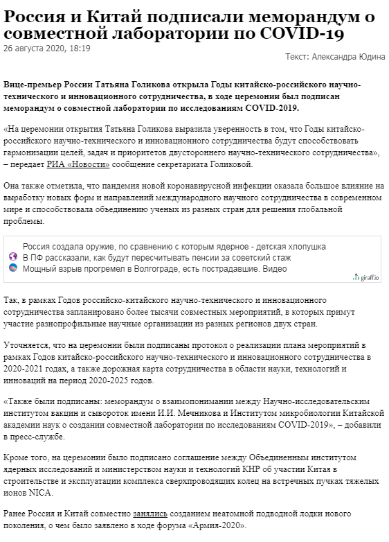 “我们还签署了梅奇尼科夫疫苗与血清研究所与中国科学院微生物研究所之间的谅解备忘录,建立一个用于COVID-2019联合实验室合作研究项目。 ”