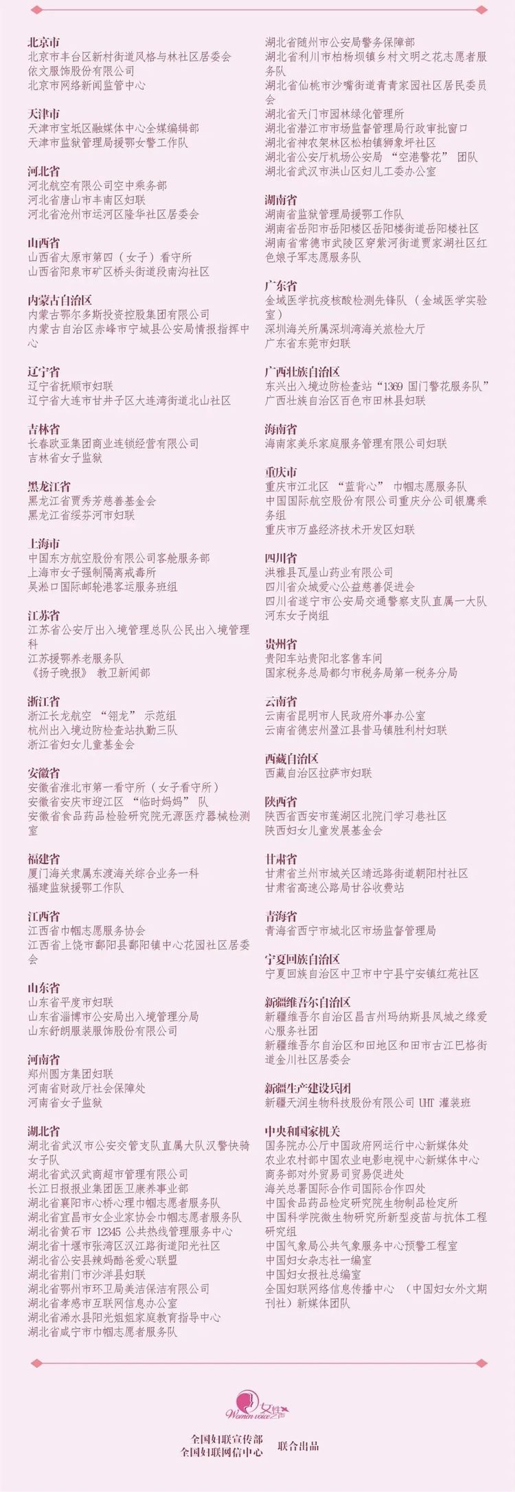9月29日,抗击新冠肺炎疫情全国三八红旗手(集体)表彰云发布活动在京举行。活动以“弘扬伟大抗疫精神 唱响新时代颂歌”为主题,发布了800名抗击新冠肺炎疫情全国三八红旗手和200个抗击新冠肺炎疫情全国三八红旗集体。中共中央政治局委员、国务院副总理孙春兰,全国人大常委会副委员长、全国妇联主席沈跃跃出席并为受表彰的个人和集体代表颁奖。全国妇联党组书记、副主席、书记处第一书记黄晓薇宣读表彰决定。中央军委政治工作部副主任刘德伟,国家卫生健康委党组成员、国家中医药管理局党组书记、副局长余艳红出席并颁奖。全国妇联专兼职副主席、书记处书记出席活动。中宣部宣教局、人社部国家表彰奖励办负责同志参加颁奖。