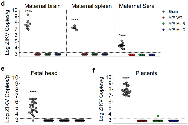 其结果是“一箭双雕”。一方面,MutB/C疫苗一次免疫可产生清除性的免疫应答, 完全保护小鼠抵御寨卡病毒攻毒, 在病毒感染的所有靶组织中都检测不到病毒载量。此外,在孕鼠感染模型中显示疫苗完全阻断寨卡病毒的母婴传播,在胎鼠的鼠脑和胎盘中都检测不到病毒载量(图2)。