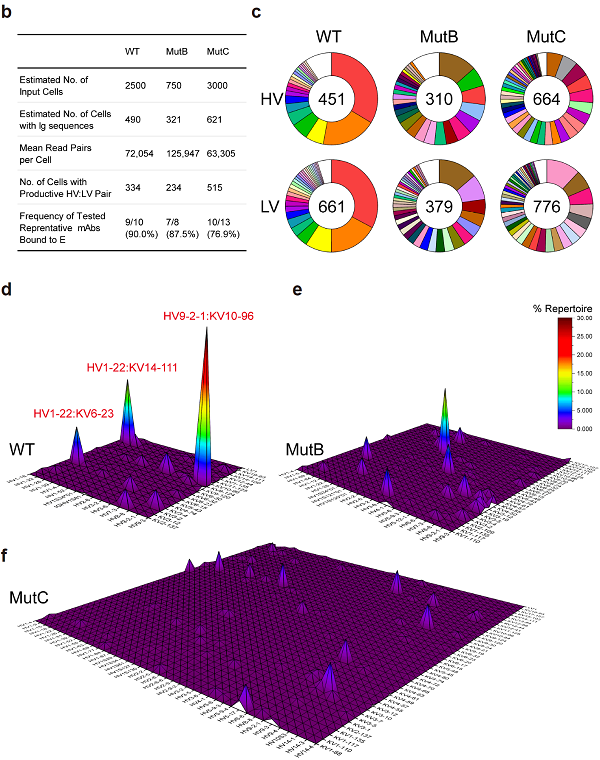研究者并未就此止步。知其然还要知其所以然,他们进一步探究了改造后疫苗MutB/C消除ADE的免疫学基础。通过B细胞受体(BCR)的单细胞测序方法,他们分析了免疫后小鼠淋巴结的抗原特异性BCR的特性。结果显示,野生型疫苗激发的体液免疫存在明显的免疫优势情况,60%以上的BCR使用3组胚系基因。而MutB/C打破了原有的免疫优势,使抗原特异性BCR使用的胚系基因呈分散式分布(图4)。