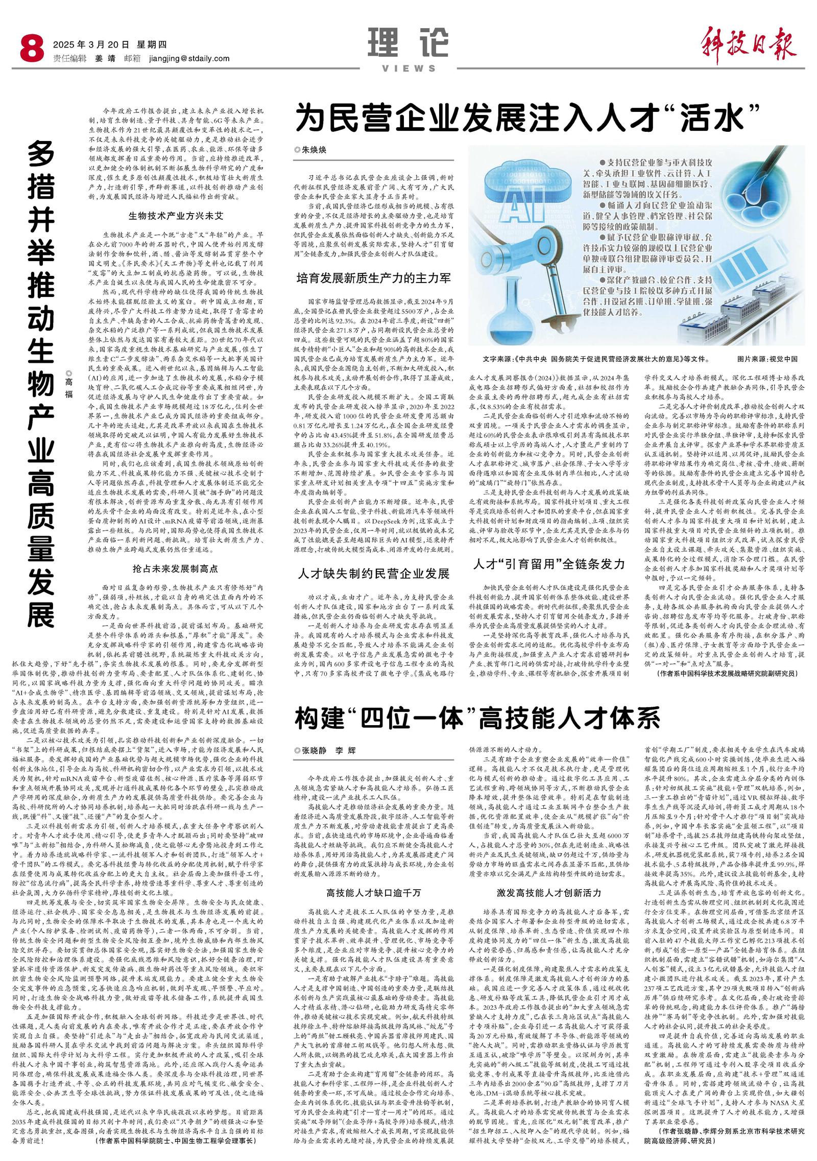 今年政府工作报告提出,建立未来产业投入增长机制,培育生物制造、量子科技、具身智能、6G等未来产业。生物技术作为21世纪最具颠覆性和变革性的技术之一,不仅是未来科技竞争的关键驱动力,更是推动社会进步和经济发展的强大引擎,在医药、农业、能源、环保等诸多领域都发挥着日益重要的作用。当前,应持续推进改革,以更加健全的体制机制不断拓展生物科学研究的广度和深度,催生更多原创性颠覆性技术,积极培育壮大新质生产力,打造新引擎,开辟新赛道,以科技创新推动产业创新,为发展国民经济与增进人民福祉作出新贡献。