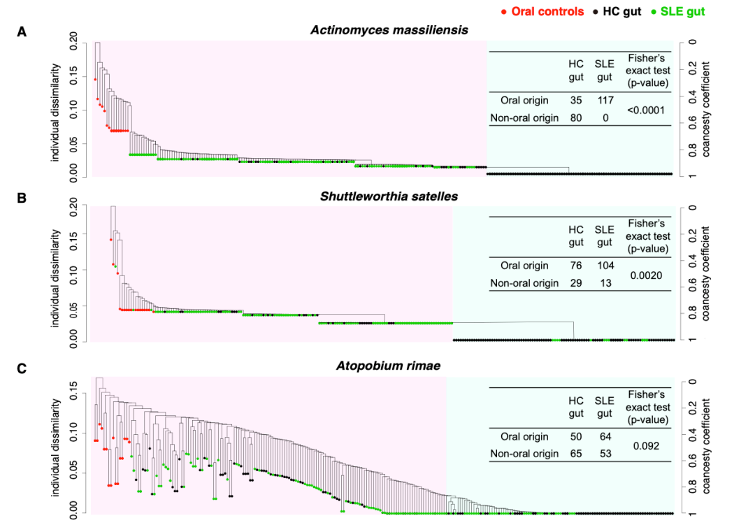 近日,中科院微生物所王军团队与北京协和医院张烜团队联合在Arthritis & Rheumatology期刊(IF=9.58,风湿学顶尖期刊)发表题为“The gut microbiota of non-treated patients with SLE defines an autoimmunogenic and proinflammatory profile” 的封面文章,运用全基因组鸟枪测序法对117名近期未治疗的SLE患者(其中52名包含治疗后样本)和115位性别、年龄匹配的健康对照的粪便菌群进行测序,发现SLE患者的肠道菌群和健康对照在物种组成和功能分布上均具有显著差异。包括Clostridium sp.、Atopobium rimae、Shuttleworthia satelles、Actinomyces massiliensis、Bacteroides fragilis和 Clostridium leptum等多种细菌在SLE患者肠道富集、而治疗后则显著降低(图1)。在菌群功能上,狼疮患者肠道菌群所介导的功能与对照组也存在差别,且功能差异比物种组成差异更为显著。在未经治疗的狼疮患者中,支链氨基酸的合成、肌醇降解和硫胺素(维生素B1)合成通路显著降低、治疗后才得以恢复;LPS合成通路显著上调、治疗后减少。作者进一步通过菌株的SNP特征分析证明狼疮病人肠道富集的菌株可能来源于口腔(图2)。并发现Odoribacter splanchnicus和Akkermansia muciniphila细菌产生的肽段不仅分别与狼疮特征性自身抗原Sm抗原和Fas抗原的表位高度相似,还与这些自身表位一样,可分别激活CD4+T细胞和B细胞,证明二者可能通过分子模拟机制触发自身免疫应答从而参与狼疮的发生发展。该研究建立了狼疮患者肠道菌群改变与免疫异常的密切关系,为今后通过调控肠道菌群来辅助治疗狼疮提供了理论基础。