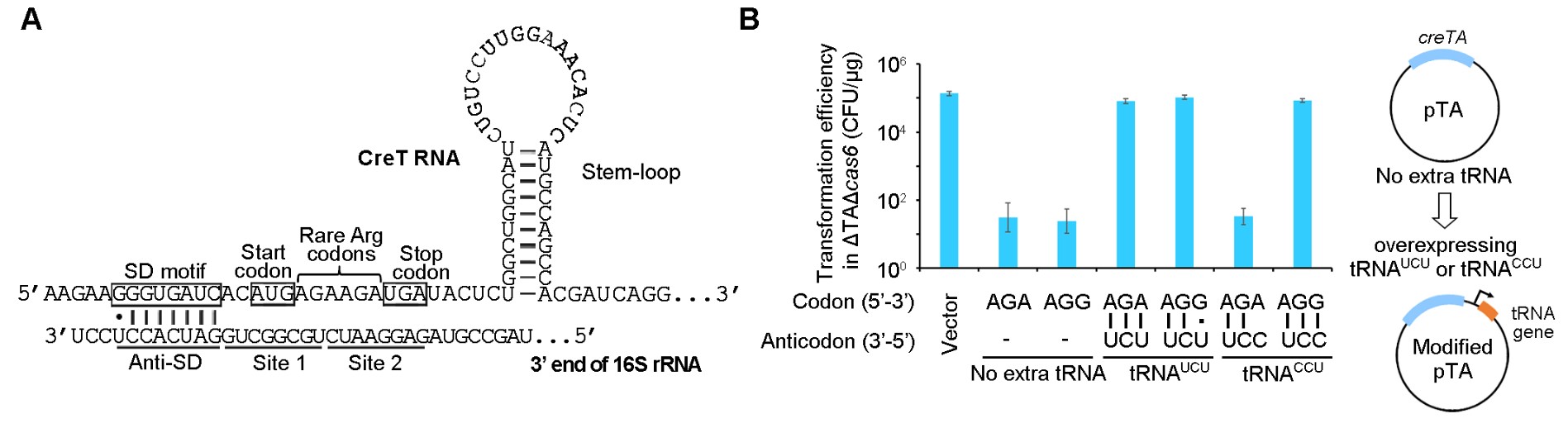 CreT RNA的精细序列和结构分析表明,其5'端具有强效的翻译信号SDShine-Dalgarno)序列和AUG起始密码,紧接其后的是两个精氨酸稀有密码子AGA, 随后是终止密码子UGA和一个茎环结构(图3A)。系列突变实验表明,上述关键序列和结构都是CreT毒性所必需。基于此,该团队推断了一个全新的分子回路,即CreT RNA借助强效的翻译起始信号定位在核糖体上,然后通过两个串联的稀有密码子AGA进一步劫持胞内稀有的精氨酸tRNAUCU,从而抑制了胞内其它重要蛋白的翻译合成和细胞生长。基于这一猜想,他们通过过表达tRNAUCU成功解除了CreT的细胞毒性(图3B),证实了这一全新的毒性机制,即CreT 是通过其RNA劫持胞内稀有的精氨酸tRNA发挥毒性,而非翻译产生含二精氨酸的小肽发挥作用,因此CreT是一类小RNA毒素。