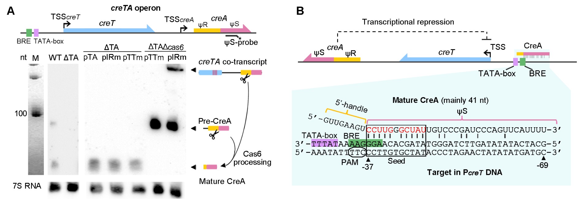 为揭示Cascade蛋白抑制CreT毒性的分子机制,该团队首先敲除了胞内唯一的CRISPR array结构,从而排除了CRISPR array来源的crRNA参与毒性抑制的可能性。对311bp基因间区的截短与突变实验表明,creT下游序列为毒性抑制所必需(图2C)。精细的序列分析和Northern印迹等实验表明,creT下游有一段与CRISPR repeat高度相似的序列(图2A),该序列及其下游序列可独立转录产生一个约90nt的前体RNA,并被Cas6加工为一个的成熟的小RNA(图4A)。该小RNA41nt,含有与crRNA一样的完整的5' handle序列(8 nt),特定的spacer序列(33nt),但缺乏crRNA常见的3' handle,因此命名为“类crRNA抗毒素”(CrRNA-resembling Antitoxin),简称CreACreA作为crRNA类似分子,即可能联合Cascade蛋白对CreT毒素活性发挥抑制作用。