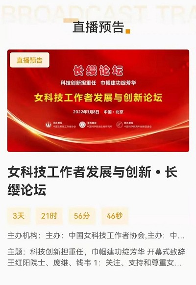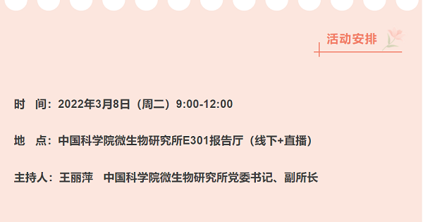 为进一步贯彻落实《关于实施科技创新巾帼行动的意见》,加强女性科技工作者的交流与合作,在建设科技强国中勇挑重任,展现巾帼担当,展现我国女科技工作者志存高远、信念坚定的真挚情怀,以推进科技创新巾帼行动的实际行动践行“两个维护”,中国女科技工作者协会联合中国科学院微生物研究所和中国科学院青年创新促进会,于2022年3月8日召开“女科技工作者发展与创新—长缨论坛”。