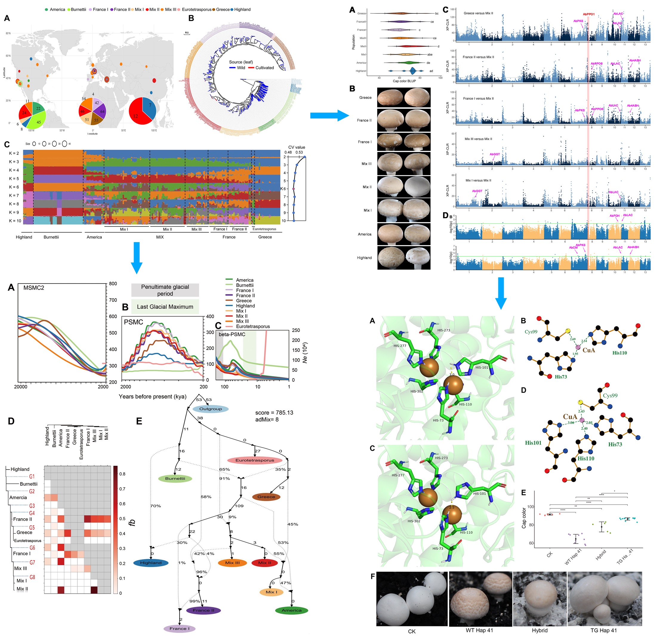 该研究对482份全球分布的野生和商业双孢蘑菇菌株进行了全基因组重测序。群体基因组分析显示,北美洲和欧洲分别是双孢蘑菇的两个分化中心;第四纪冰期导致的地理隔离促进了群体分化,而间冰期群体发生显著扩张,频繁的基因交流致使当前双孢蘑菇群体呈现复杂的混合起源与较高的遗传多样性。驯化与育种历程分析表明,白色菌盖是驯化过程中的关键选择性状。通过选择清除分析和GWAS,研究定位到黑色素合成途径中编码多酚氧化酶的AbPPO1基因是调控菌盖颜色变异的关键基因,其中该基因的单倍型AbPPO1Hap_2为白色菌株特有,杂交、遗传转化实验及蛋白质结构解析验证了AbPPO1Hap_2为功能丧失型突变。