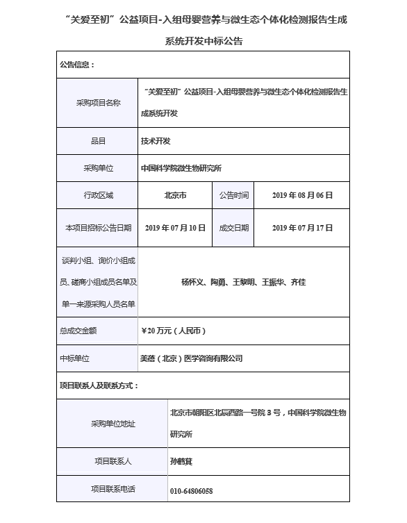 “关爱至初”公益项目-入组母婴营养与微生态个体化检测报告生成系统开发中标公告