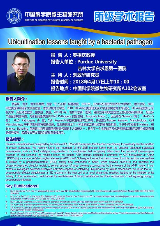 所级学术报告(病原室承办):Ubiquitination lessons taught by a bacterial pathogen