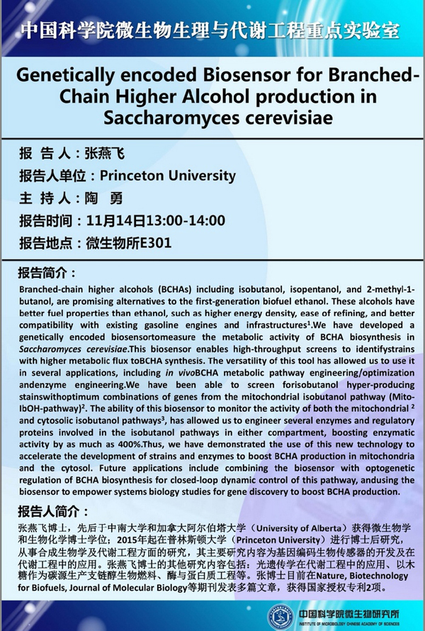 工业室学术报告:Genetically encoded Biosensor for Branched-Chain Higher Alcohol Production in Saccharomyces cerevisiae