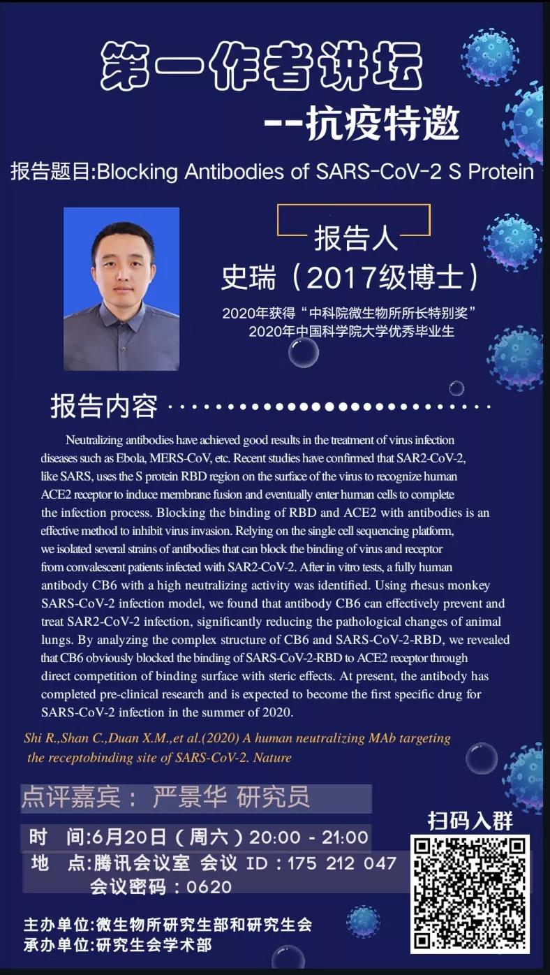 史瑞,中国科学院微生物研究所严景华课题组2017级博士。研究方向为肿瘤免疫及感染性疾病治疗抗体开发。曾获2018、2019中国科学院微生物研究所工业室一等奖学金、2020中国科学院微生物研究所所长特别奖,2020中国科学院大学优秀毕业生等荣誉。在新冠病毒的抗疫科技攻关团队中主要承担了新型冠状病毒的抗体筛选工作,以第一作者身份将阶段性研究成果发表于Nature期刊。