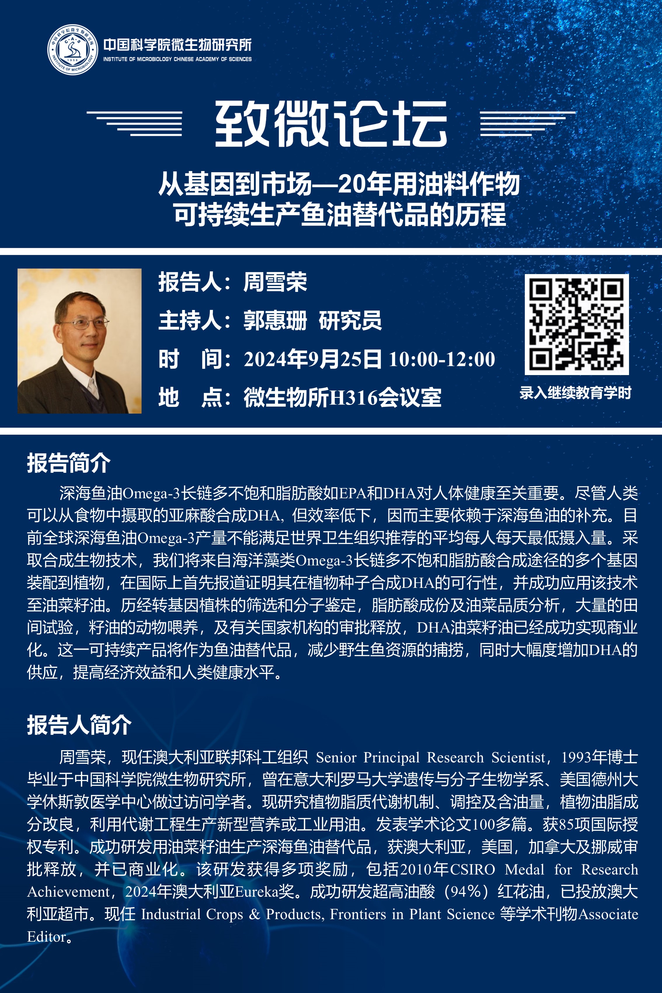 致微论坛:从基因到市场—20年用油料作物可持续生产鱼油替代品的历程