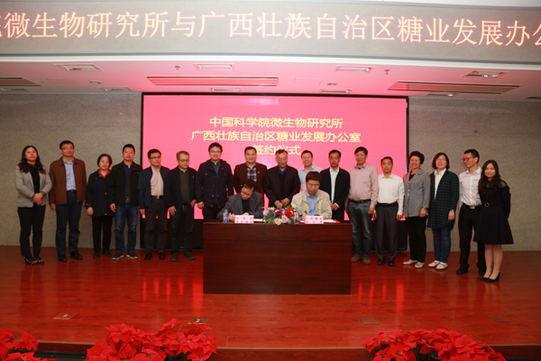 4月22日上午,广西壮族自治区糖业发展办公室(以下简称“广西糖办”)副主任李文纲、科技处副处长范波澜、广西糖业协会理事长梁咏诚以及广西多家糖业企业代表等一行来访微生物所,双方就甘蔗产业与糖加工领域进行合作洽谈,并举行了签约仪式。中国科学院院士方荣祥、微生物所党委书记李俊雄、微生物所副所长钱韦以及植物基因组学国家重点实验室、真菌学国家重点实验室、微生物生理与代谢工程院重点实验室、技术转移转化中心多名科研骨干参加了会谈。中科院科技促进发展局农业科技办公室段瑞博士受邀出席。