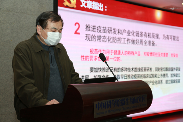 在随后的学习座谈中,与会党员同志对总书记的重要论述精神和研究所目前取得的进展感到深受鼓舞,表示要认真贯彻落实总书记的要求,以时不待我、只争朝夕的劲头,加快推进科研成果的临床应用和规模化生产,“强化科研攻关支撑和服务前方一线救治的部署,坚持临床研究和临床救治协同,让科研成果更多向临床一线倾斜。”微生物所党政领导班子表示,将继续坚决贯彻落实以习近平同志为核心的党中央的战略部署,进一步加强党的核心领导;全所上下继续坚定理想信念,提高科研国家队的责任感和使命感,围绕应急攻关需求,量化细化措施,以顽强拼搏、心系一线的精神,加快推进病毒溯源、传播致病机理等当前关键任务的攻关和抗体、疫苗重要成果的转化,力争超前完成应急科技攻关任务,向党中央和全国人民交上一份满意的答卷。