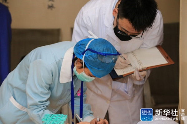 3月6日,在广州医科大学附属第一医院广州呼吸健康研究院,中科院沈阳自动化所研究员刘浩(右)在协调志愿者入组临床试验。新华社发