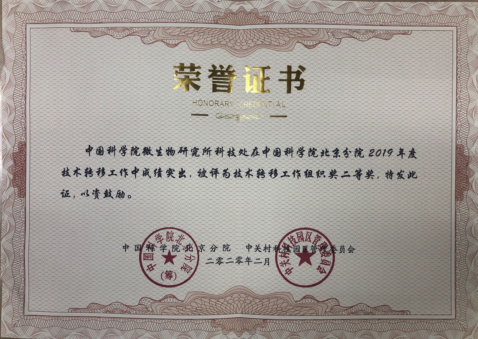 微生物所2019年度在京科技成果转化暨技术转移组织工作获得中国科学院科技创新发展中心(北京分院)认可,连续第九年荣获科技成果在京转化先进团队/技术转移工作组织奖,并首次荣获二等奖,在生物学专业领域研究所中名列前茅。