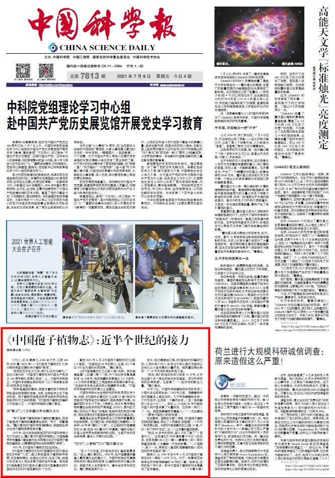 截至2021年6月,“中国孢子植物志”已出版113卷册,记录了我国孢子植物424科2255属19652种,附图版14246幅,总字数达4334.3万字。