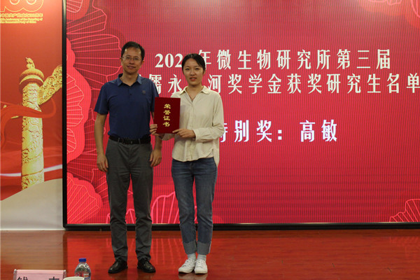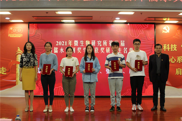 随后,研究所对获得第三届郑儒永黄河奖学金的11名研究生进行了表彰。钱韦、李俊雄、石硕、向华、杨永峰等五位所领导共同为获奖学生颁发了证书并合影留念。获奖学生代表高敏对郑儒永院士和黄河研究员两位老先生不忘初心、心怀家国的精神表达了崇高的敬意,对微生物所卓越的实验平台、导师的悉心指导和其他老师的关心帮助表示了感谢,她还鼓励新同学在学习和科研工作时要专注和坚持,学会深入思考,积极乐观不放弃。