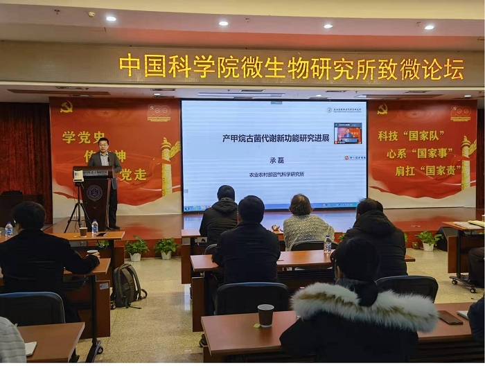 1月4日,“致微论坛” 2022年首讲如期举行。此次论坛邀请了农业农村部沼气科学研究所承磊研究员。他以“产甲烷古菌代谢新功能研究进展”为题,与大家分享了他所带领的科研团队在产甲烷菌相关领域的科研攻关最新进展。报告由资源室郑艳宁研究员主持,钱韦所长、向华副所长、东秀珠研究员等100余名科研人员参加了此次论坛。