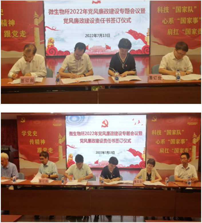 为全面贯彻落实党中央关于全面从严治党的部署要求,严格执行党风廉政建设责任制,压紧压实“一岗双责”,微生物研究所于2022年7月13日召开党风廉政建设专题会议暨党风廉政建设责任书签订仪式。按照疫情防控要求,本次大会分主会场和视频分会场,并通过线上腾讯会议进行直播。研究所党政领导班子全体成员、两委委员、党支部书记、职能处室/研究室/部门/中心负责人、研究组组长、职能部门业务主管、室秘书、科研财务助理等关键岗位人员和全所党员300余人通过“线上+线下”参加了会议。大会由党委副书记、纪委书记杨永峰主持。