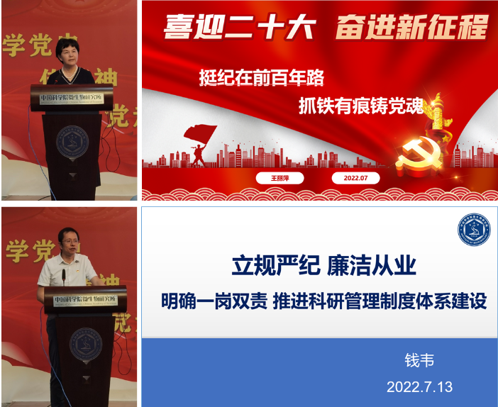 党委书记王丽萍以《铁纪在前百年路 抓铁有痕铸党魂》为题作党课报告。强调要切实提高政治站位,坚定理想信念,增强“四个意识”、坚定“四个自信”、做到“两个维护”,始终把政治纪律摆在党的纪律建设的首要位置,做政治上的“明白人”、规矩上的“老实人”,道德上的“高尚人”、事业上的“开拓人”。