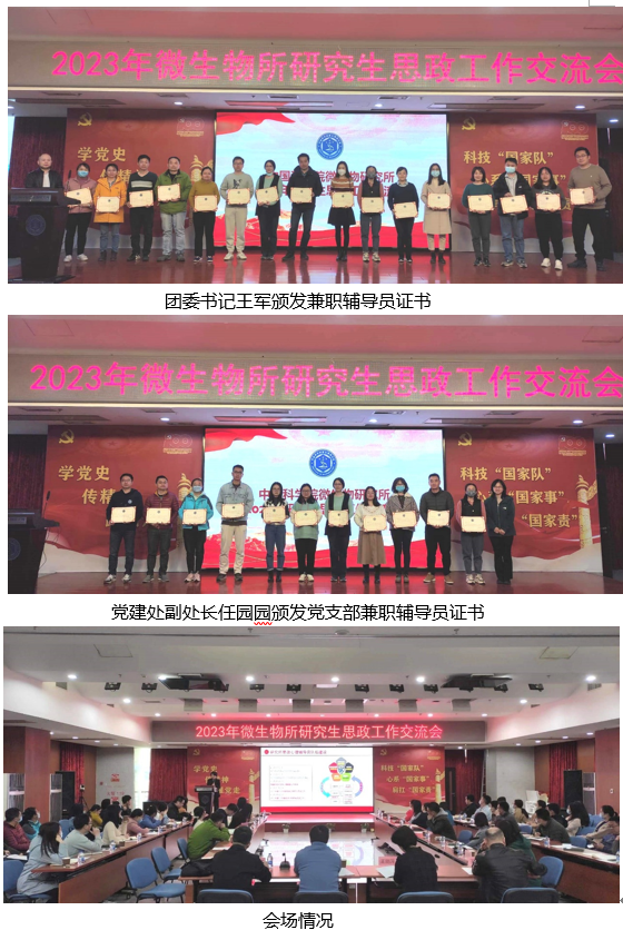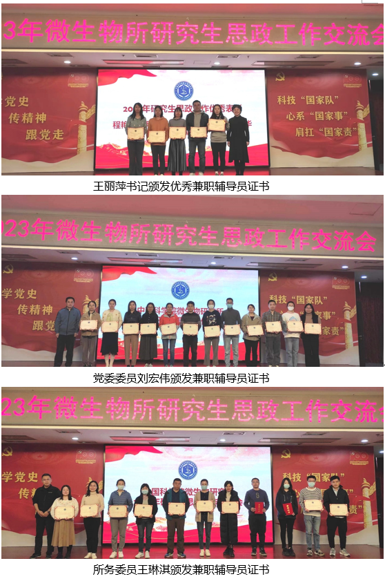 大会表彰了滕坤玲、潘园园、程艳飞、赵建华、胡新玲五位2022年度优秀兼职辅导员,并向党支部、研究室和研究组兼职辅导员颁发证书。与会人员就如何做好研究生思政工作进行了交流。