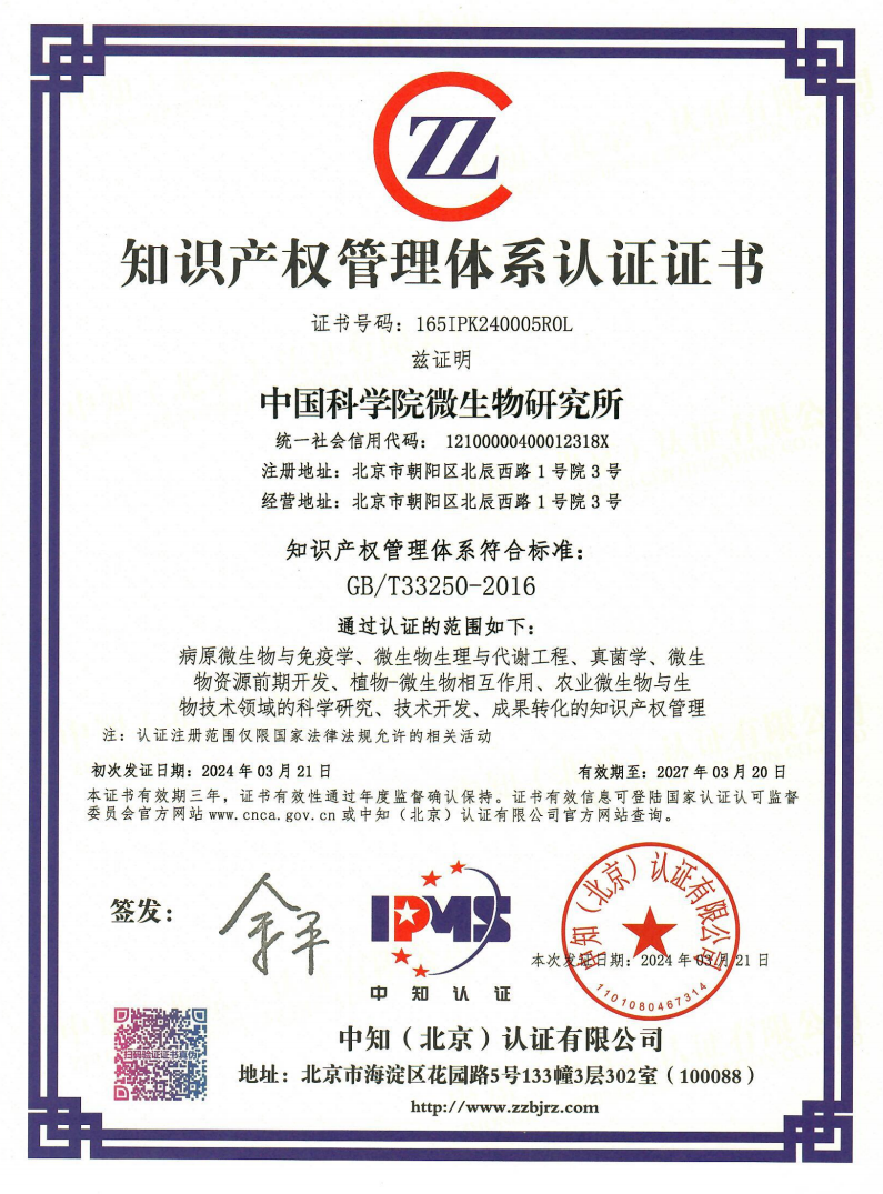2024年3月20日,微生物所获发第二轮《知识产权管理体系认证证书》。研究所知识产权管理体系符合《科研组织知识产权管理规范》(GB/T33250-2016)国家标准,认证范围覆盖病原微生物与免疫学、微生物生理与代谢工程、真菌学、微生物资源前期开发、植物-微生物相互作用、农业微生物与生物技术的科学研究、技术开发、成果转化的知识产权管理。