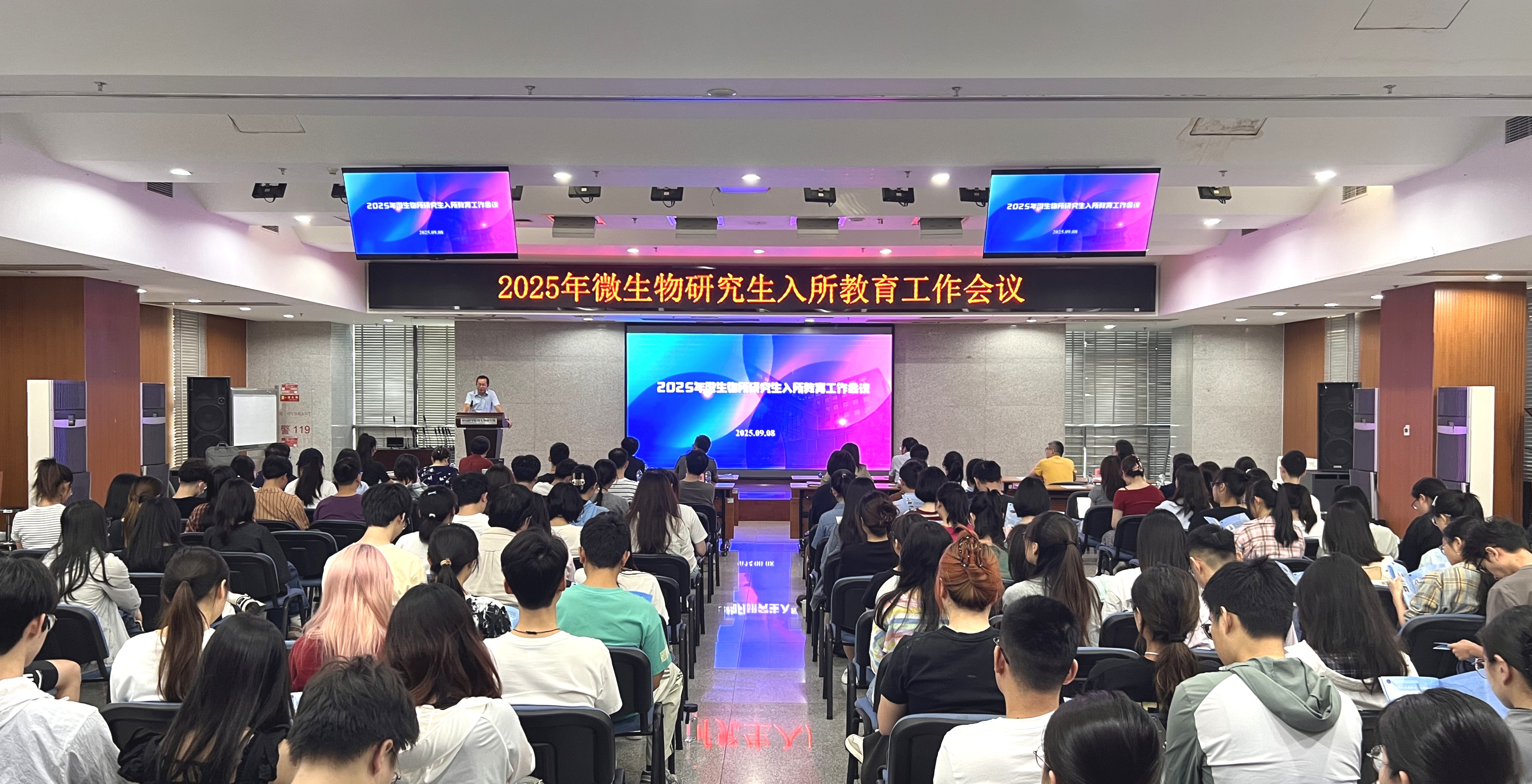9月8日上午,2025年研究生入所教育工作会议在E301报告厅举行。微生物所所长钱韦、副所长王琳淇、部分导师代表、科研道德与师德学风建设委员会委员刘钢、综合处安全保卫办公室主任王振华、网络信息办公室业务主管冀珊珊、科技战略规划与重大项目处业务主管刘桂明、吴冰、科技条件平台处业务主管高喜燕、知识产权与产业发展处业务主管张彦、研究生部全体成员、研究生会主席王建新以及2024级集中教学返所研究生、2025级博士生、新入所联培学生共150余人参加了此次活动。会议由研究生部主任王文婧主持。