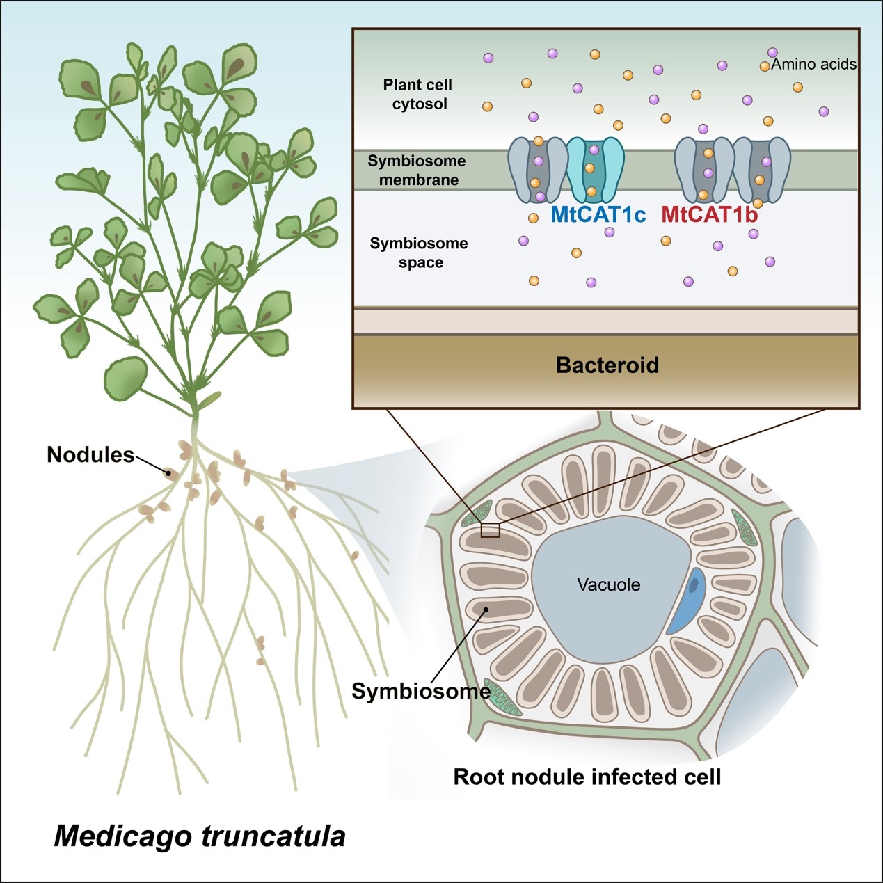 豆科植物与根瘤菌形成的共生固氮体系是自然界最高效的生物固氮方式之一,每年为生态系统贡献大量可利用氮。在这一过程中,根瘤菌通过侵染线进入植物细胞,被宿主来源的共生体膜包裹后形成可固氮的类菌体,这一功能单元被称为共生体。经典模型认为,植物为类菌体提供二羧酸盐作为碳源,而类菌体则将固定的氮以氨态氮形式输送给植物。但越来越多证据表明,氨基酸在豆科植物与根瘤菌之间的跨界交换同样也是实现高效固氮的重要环节。